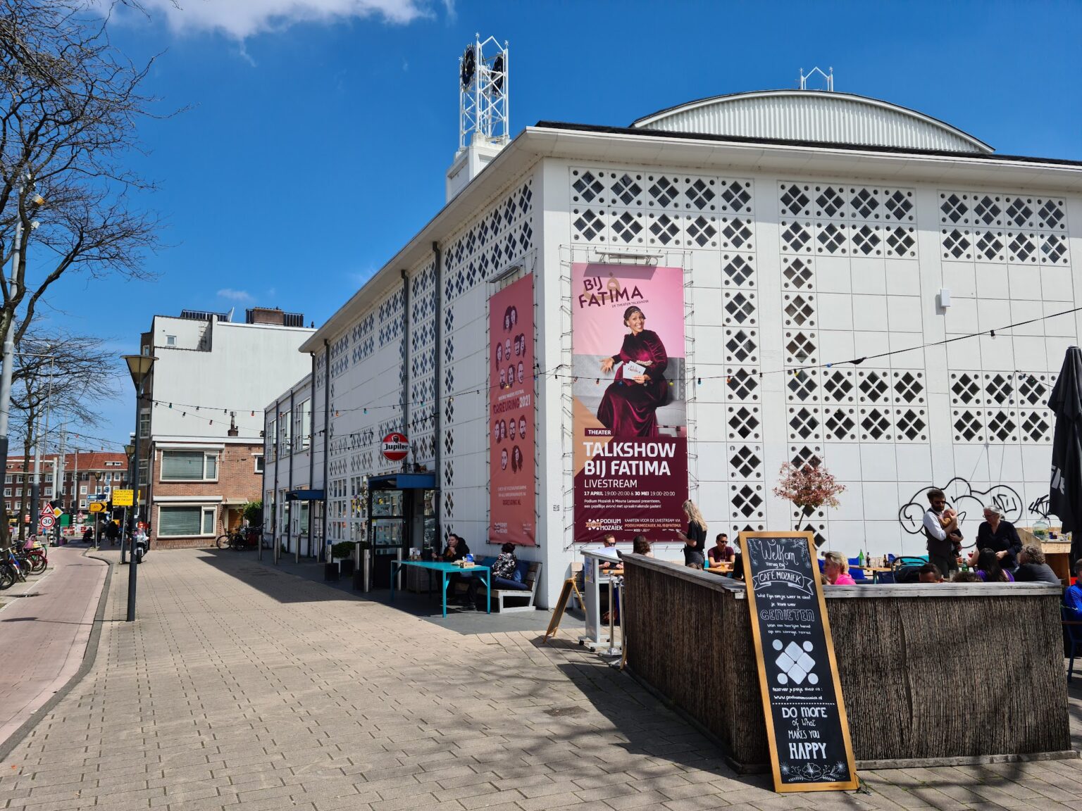 In the centre of Amsterdam-West you experience a small version of the world. At Bos & Lommer you find colourful school classes among hoodies and sports socks and Podium Mozaïek and Café Mozaïek among hip sports socks. | This cultural centre is open daily from 11.00 a.m. to 00.00 p.m. for brunches, lunches and (late night) dinners. The Mediterranean-inspired menu features largely vegetable dishes, freshly prepared daily with as much local produce as possible. | With its extensive own programming and as a festival venue for festivals such as IDFA and Grachtenfestival, Mozaïek is an outlet for creatives, lovers of music, theatre, film, dance and comedy. | The theatre hall, studios and café are also available for hire.